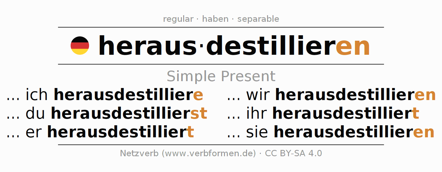 The verb herausdestillieren fully conjugated in all persons and numbers in the Present Indicative