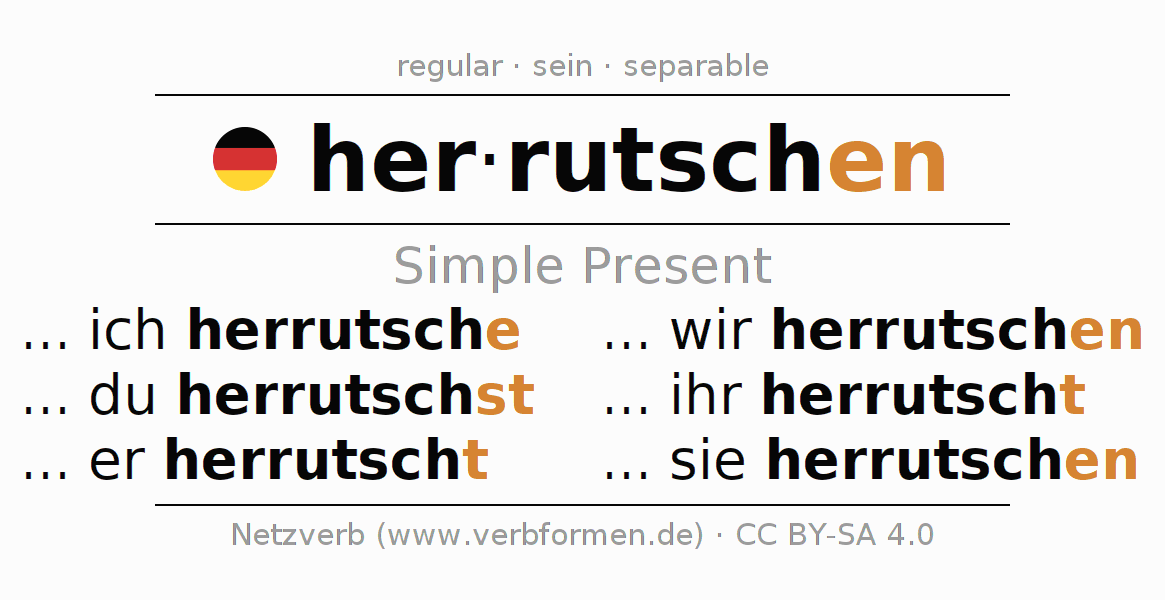 The conjugation of herrutschen in Present Indicative Presence Active is ... ich herrutsche, ... du herrutschst, ... er herrutscht, ... wir herrutschen, ... ihr herrutscht, ... sie herrutschen.The conjugation corresponds to certain grammatical rules. Likewise the requirements for the conjugation of the simple verb forms of herrutschen in Present. Comments ☆