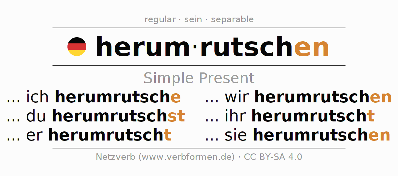 The conjugation of herumrutschen in Present Indicative Presence Active is ... ich herumrutsche, ... du herumrutschst, ... er herumrutscht, ... wir herumrutschen, ... ihr herumrutscht, ... sie herumrutschen.The conjugation corresponds to certain grammatical rules. Likewise the requirements for the conjugation of the simple verb forms of herumrutschen in Present. Comments ☆