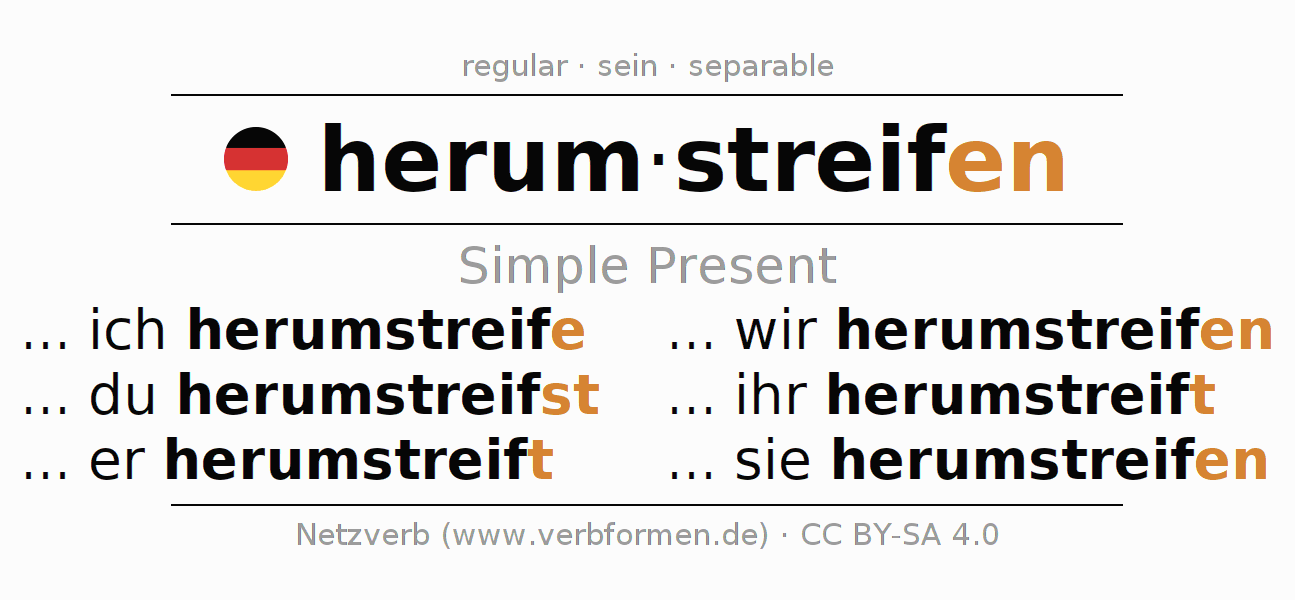 The conjugation of herumstreifen in Present Indicative Presence Active is ... ich herumstreife, ... du herumstreifst, ... er herumstreift, ... wir herumstreifen, ... ihr herumstreift, ... sie herumstreifen.The conjugation corresponds to certain grammatical rules. Likewise the requirements for the conjugation of the simple verb forms of herumstreifen in Present. Comments ☆