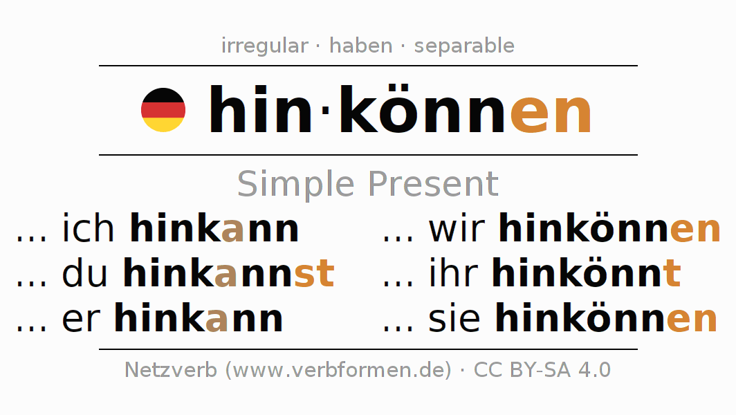 The conjugation of hinkönnen in Present Indicative Presence Active is ... ich hinkann, ... du hinkannst, ... er hinkann, ... wir hinkönnen, ... ihr hinkönnt, ... sie hinkönnen.The conjugation corresponds to certain grammatical rules. Likewise the requirements for the conjugation of the simple verb forms of hinkönnen in Present. Comments ☆