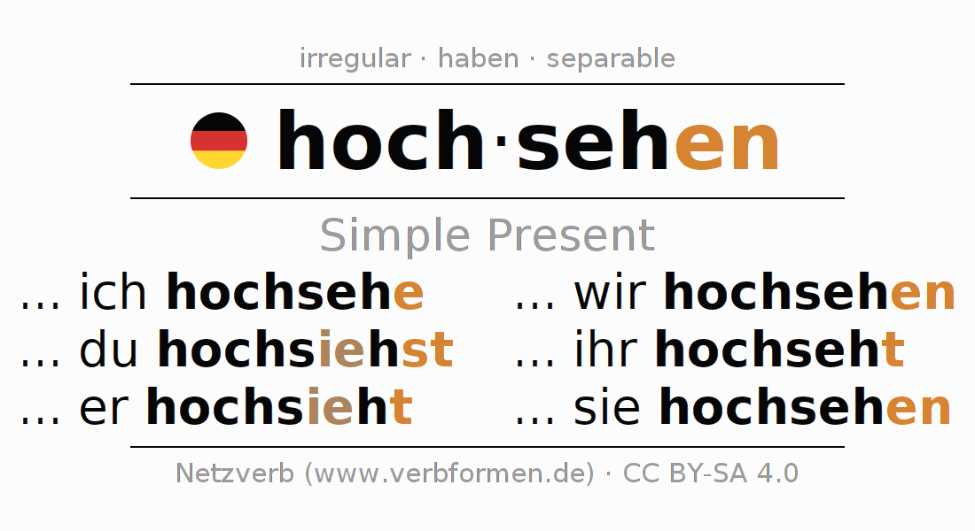 The conjugation of hochsehen in Present Indicative Presence Active is ... ich hochsehe, ... du hochsiehst, ... er hochsieht, ... wir hochsehen, ... ihr hochseht, ... sie hochsehen.The conjugation corresponds to certain grammatical rules. Likewise the requirements for the conjugation of the simple verb forms of hochsehen in Present. Comments ☆