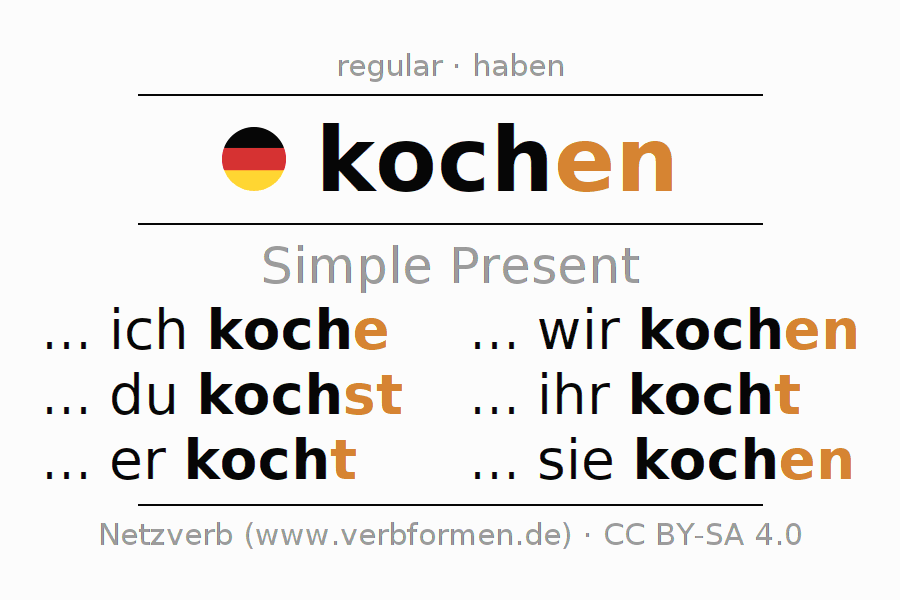 The verb kochen fully conjugated in all persons and numbers in the Present Indicative
