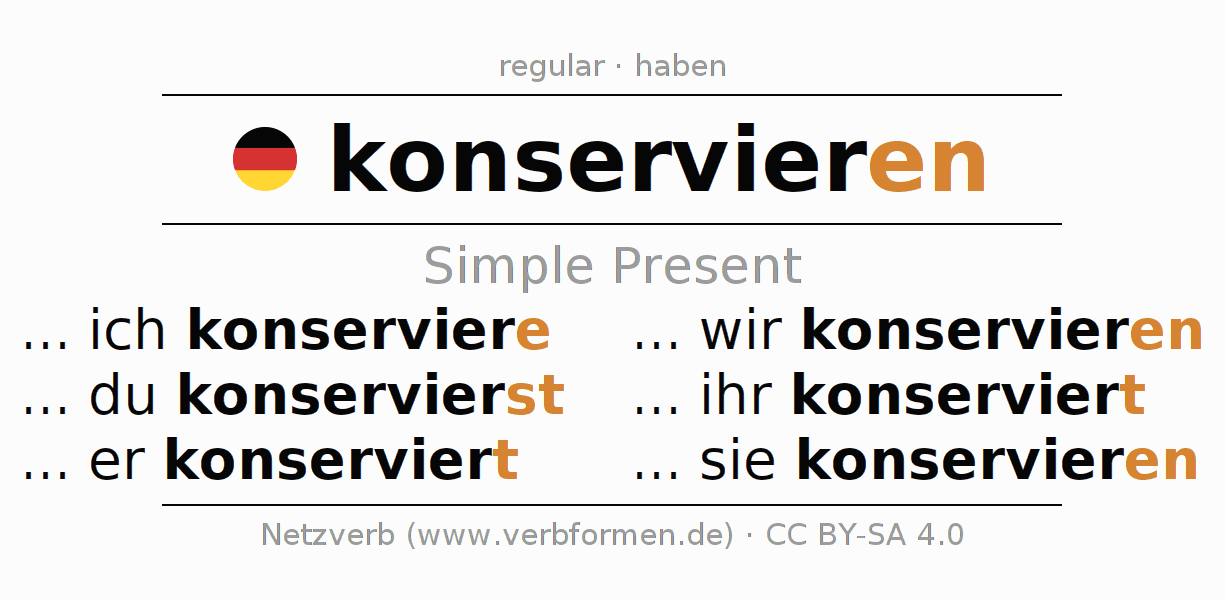 The verb konservieren fully conjugated in all persons and numbers in the Present Indicative