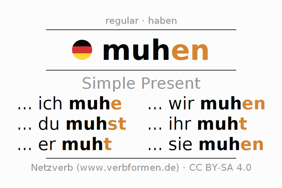 The verb muhen fully conjugated in all persons and numbers in the Present Indicative