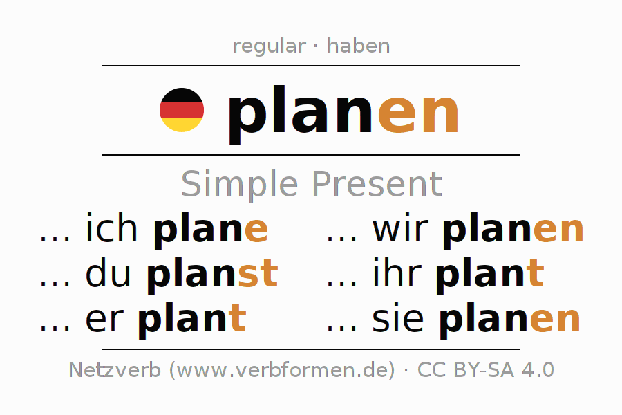 The verb planen fully conjugated in all persons and numbers in the Present Indicative