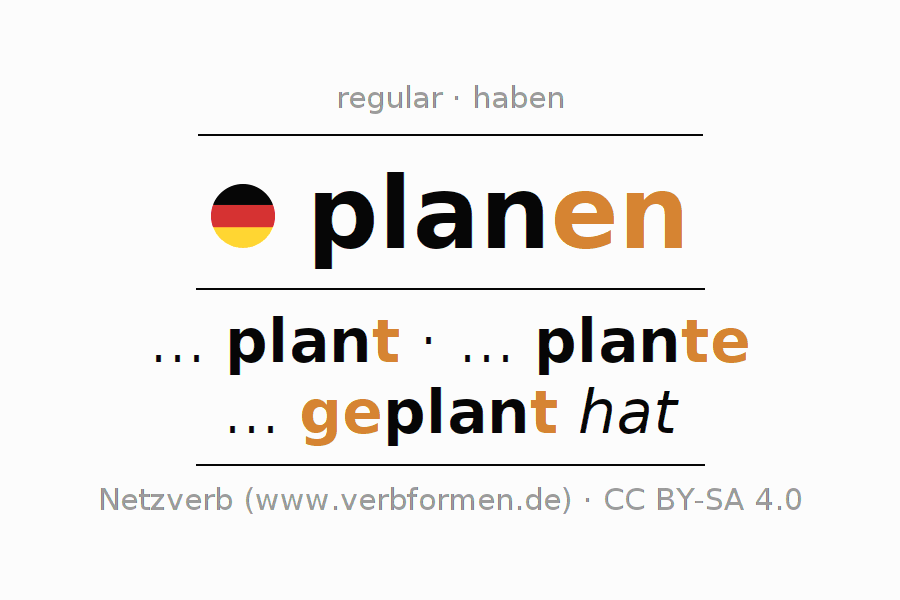 The conjugation of planen in Present Indicative Presence Active is ... ich plane, ... du planst, ... er plant, ... wir planen, ... ihr plant, ... sie planen.The conjugation corresponds to certain grammatical rules. Likewise the requirements for the conjugation of the simple verb forms of planen in Present. Comments ☆