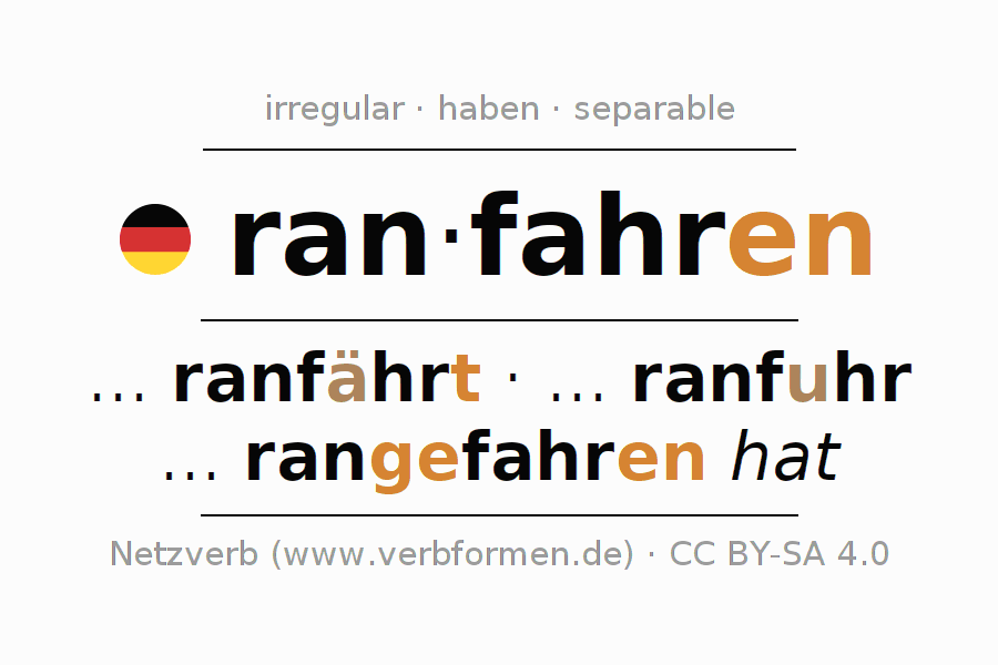 The verb ranfahren (hat) fully conjugated in all persons and numbers in the Present Indicative