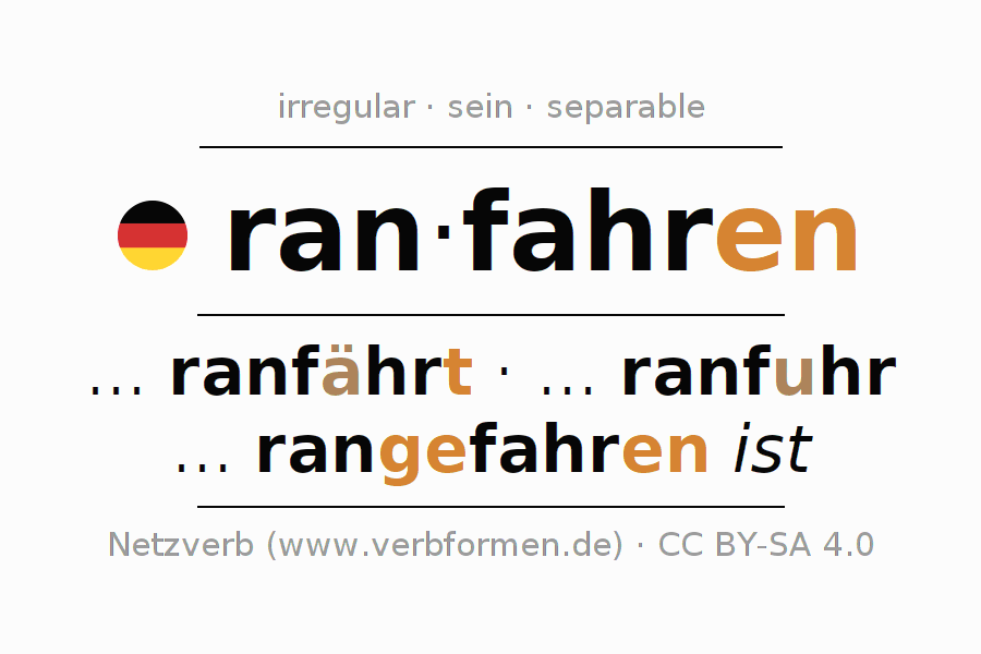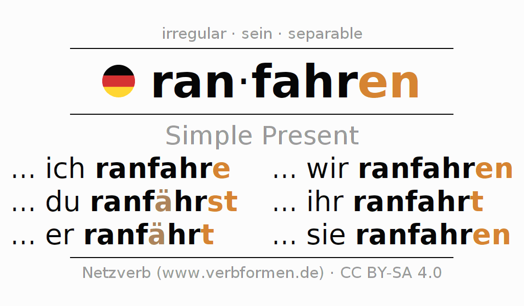 The conjugation of ranfahren in Present Indicative Presence Active is ... ich ranfahre, ... du ranfährst, ... er ranfährt, ... wir ranfahren, ... ihr ranfahrt, ... sie ranfahren.The conjugation corresponds to certain grammatical rules. Likewise the requirements for the conjugation of the simple verb forms of ranfahren in Present. Comments ☆