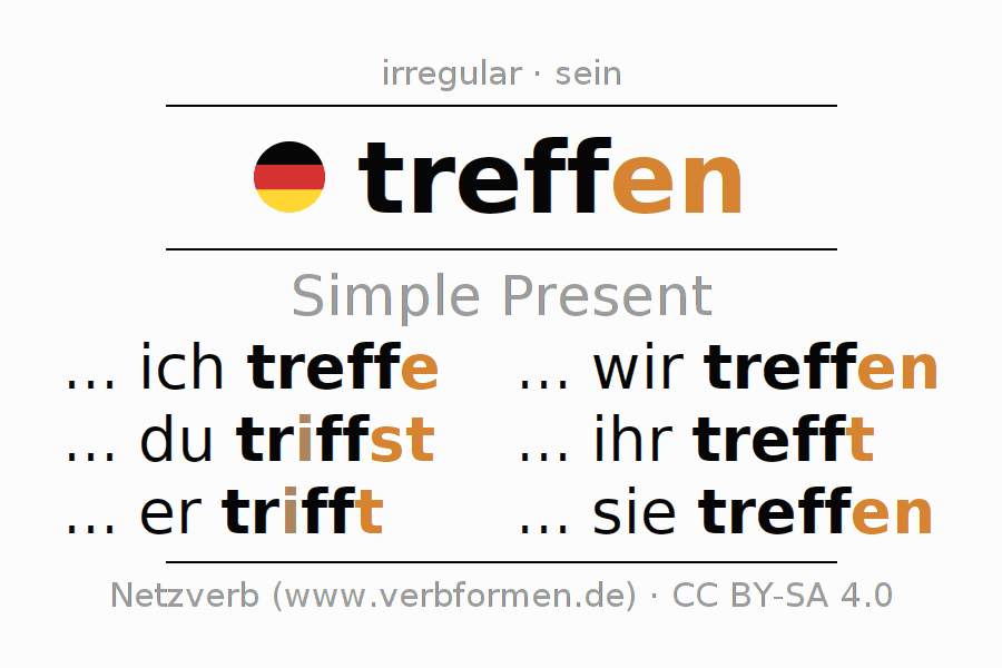 The verb treffen (ist) fully conjugated in all persons and numbers in the Present Indicative