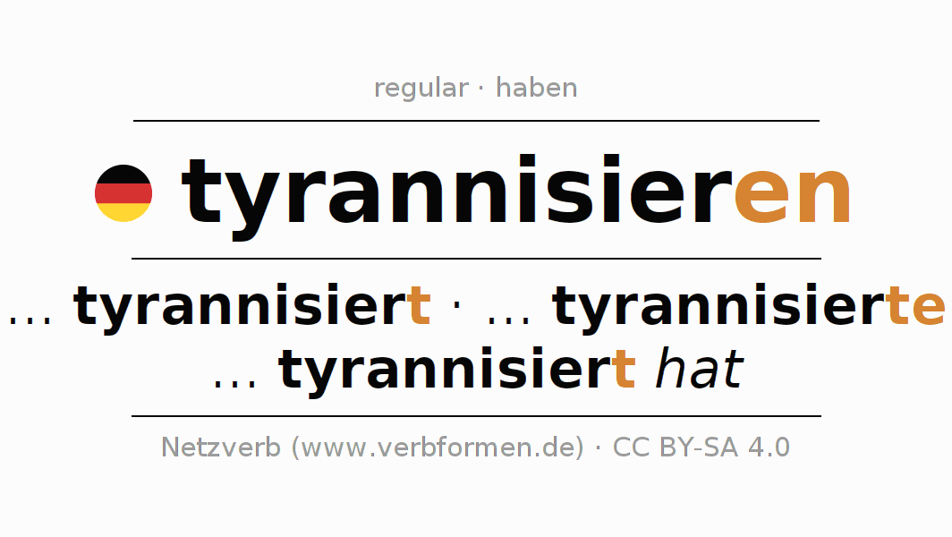 The conjugation of tyrannisieren in Present Indicative Presence Active is ... ich tyrannisiere, ... du tyrannisierst, ... er tyrannisiert, ... wir tyrannisieren, ... ihr tyrannisiert, ... sie tyrannisieren.The conjugation corresponds to certain grammatical rules. Likewise the requirements for the conjugation of the simple verb forms of tyrannisieren in Present. Comments ☆
