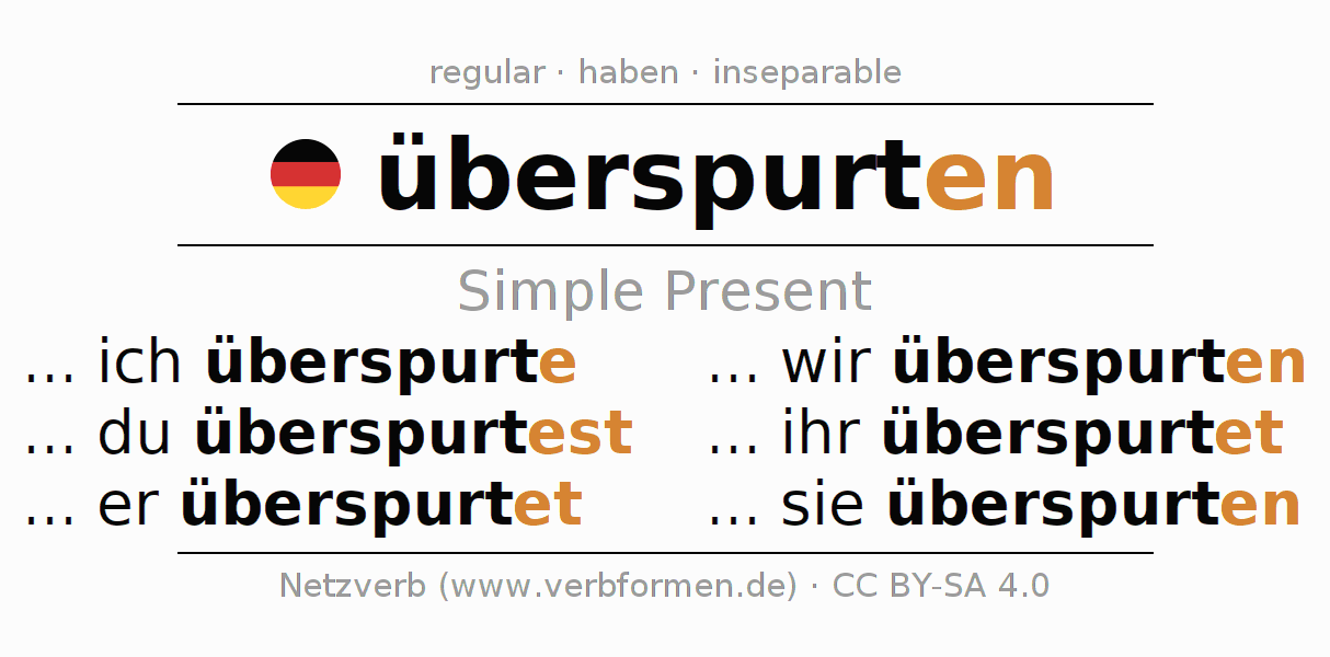 The verb überspurten fully conjugated in all persons and numbers in the Present Indicative