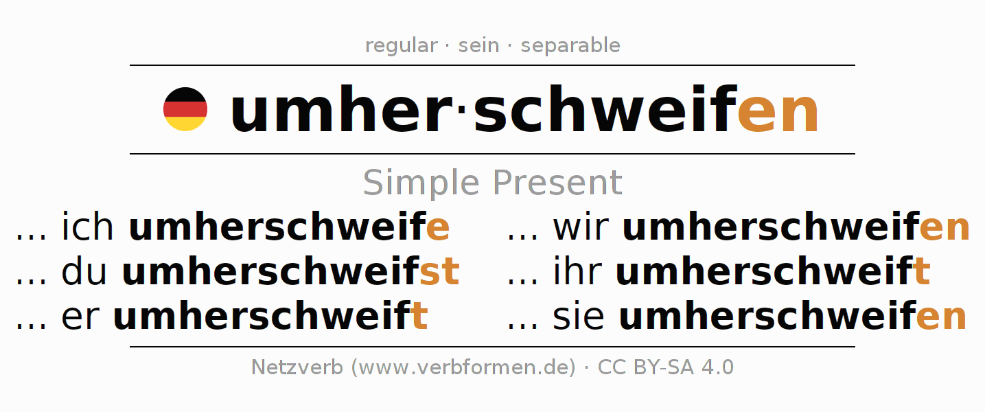 The verb umherschweifen fully conjugated in all persons and numbers in the Present Indicative