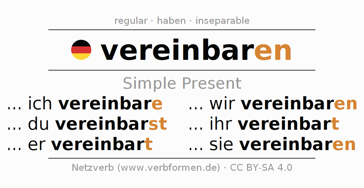 The verb vereinbaren fully conjugated in all persons and numbers in the Present Indicative