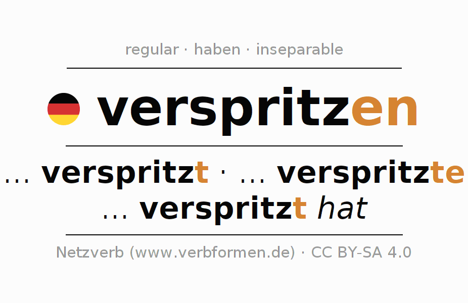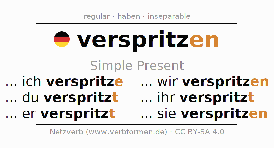 The conjugation of verspritzen in Present Indicative Presence Active is ... ich verspritze, ... du verspritzt, ... er verspritzt, ... wir verspritzen, ... ihr verspritzt, ... sie verspritzen.The conjugation corresponds to certain grammatical rules. Likewise the requirements for the conjugation of the simple verb forms of verspritzen in Present. Comments ☆