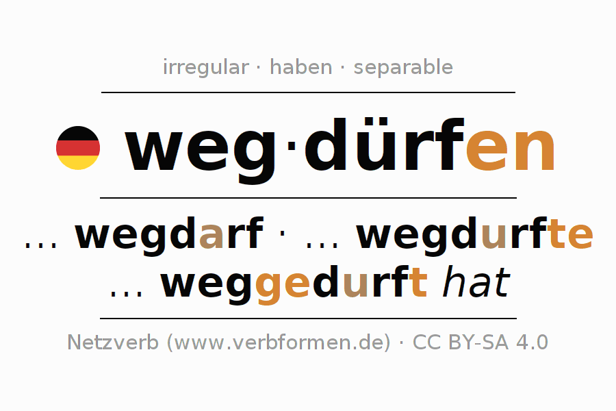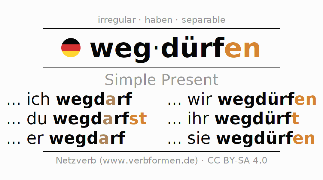 The conjugation of wegdürfen in Present Indicative Presence Active is ... ich wegdarf, ... du wegdarfst, ... er wegdarf, ... wir wegdürfen, ... ihr wegdürft, ... sie wegdürfen.The conjugation corresponds to certain grammatical rules. Likewise the requirements for the conjugation of the simple verb forms of wegdürfen in Present. Comments ☆