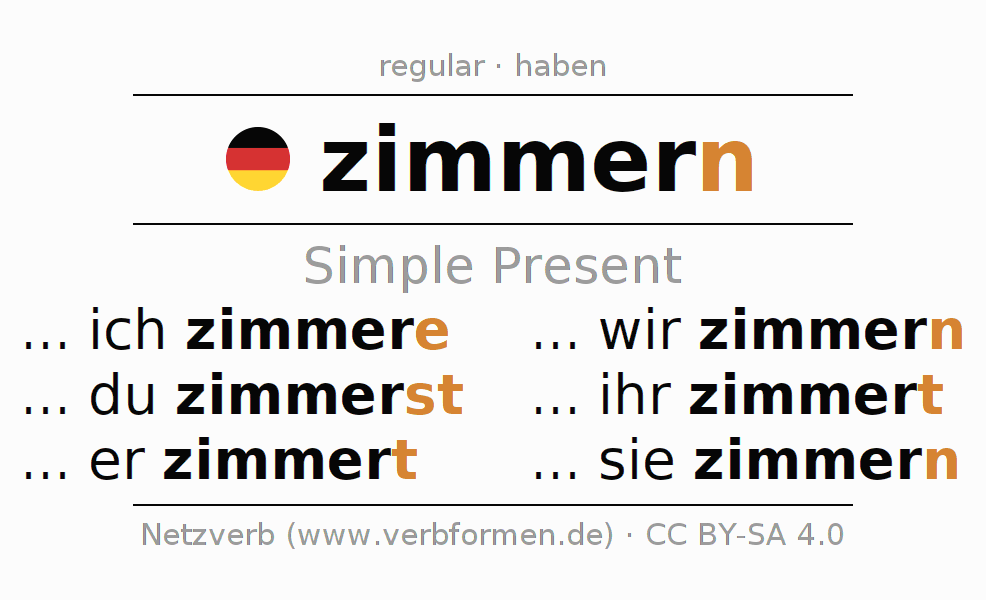 The verb zimmern fully conjugated in all persons and numbers in the Present Indicative