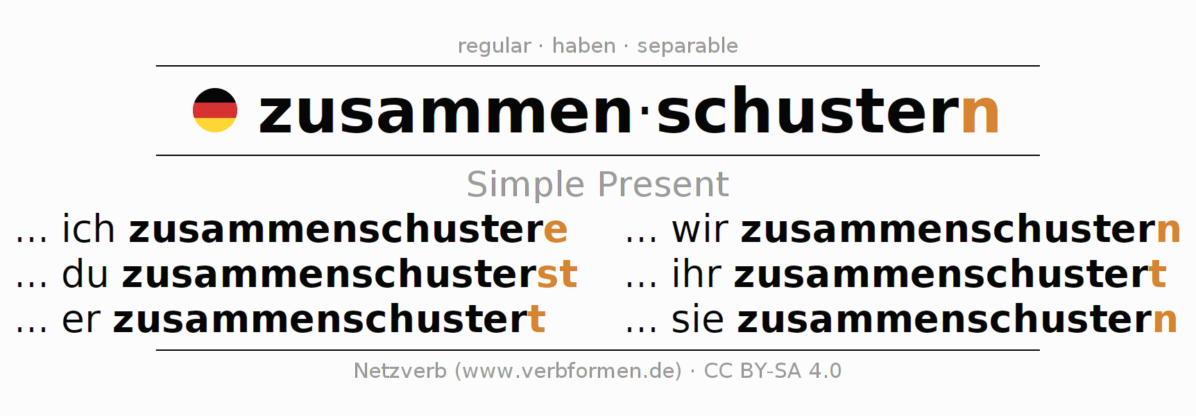 The verb zusammenschustern fully conjugated in all persons and numbers in the Present Indicative
