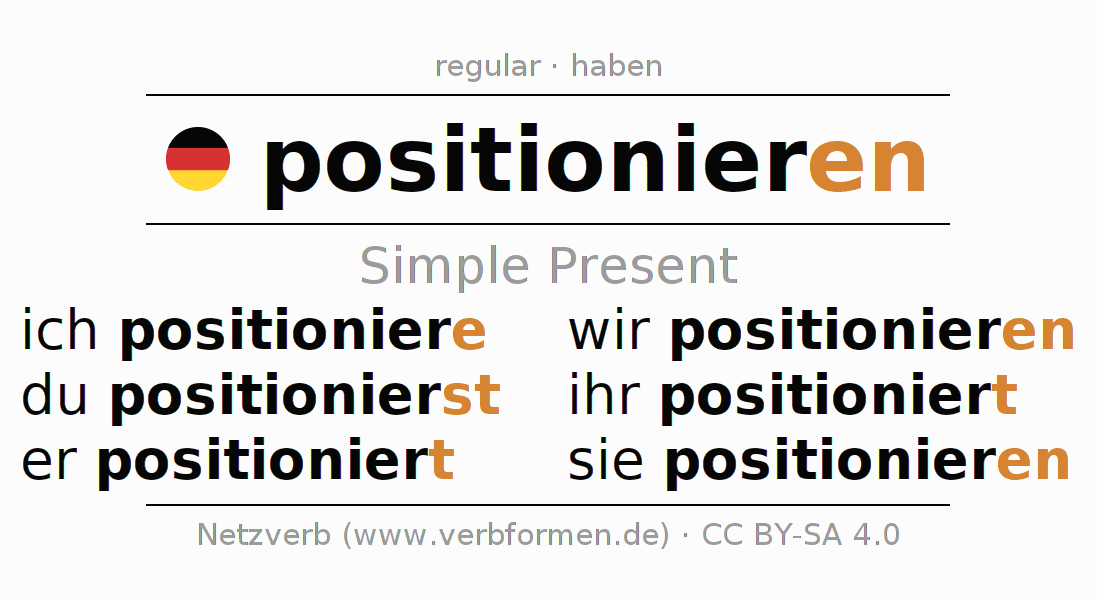 The conjugation of positionieren (position, assert) in the present tense is: ich positioniere, du positionierst, er positioniert, wir positionieren, ihr positioniert, sie positionieren. For this purpose, the endings -e, -st, -t, -en, -t, -en are appended to the stem positionier. The formation of the forms corresponds to the grammatical rules for the conjugation of the verbs in the present tense. Comments ☆