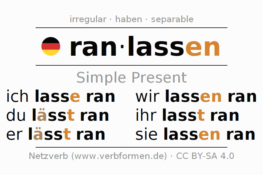 The conjugation of ranlassen (allow in, allow to prove) in the present tense is: ich lasse ran, du lässt ran, er lässt ran, wir lassen ran, ihr lasst ran, sie lassen ran. For this purpose, the endings -e, -t, -t, -en, -t, -en are appended to the stem lass.As an irregular verb in the 2nd and 3rd person singular the changed present stem läss- is used. The ending in the second person singular is shortened by "s", since the stem already ends on -s. The prefix ran- of ranlassen is separated.The formation of the forms corresponds to the grammatical rules for the conjugation of the verbs in the present tense. Comments ☆