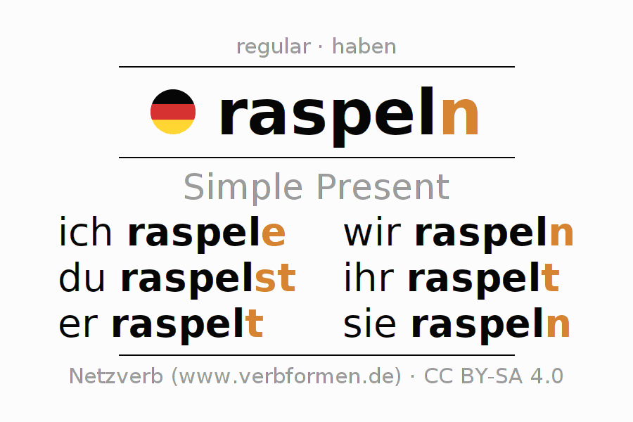 The verb raspeln fully conjugated in all persons and numbers in the Present Indicative
