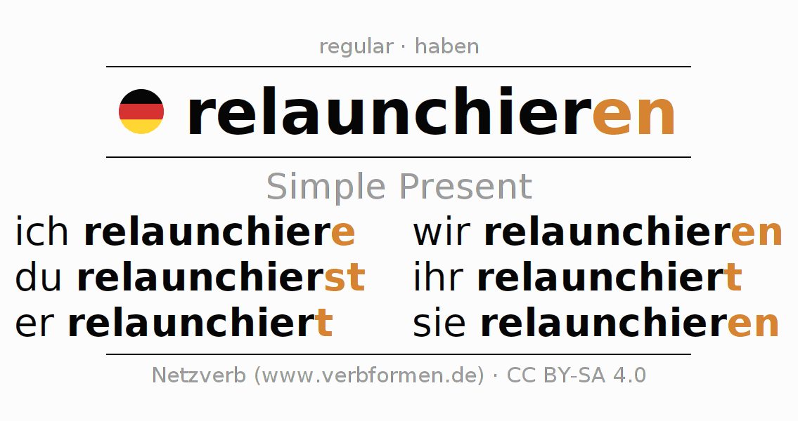 The verb relaunchieren fully conjugated in all persons and numbers in the Present Indicative