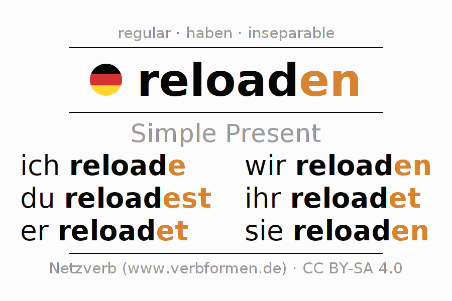 The conjugation of reloaden (refresh, reload) in the present tense is: ich reloade, du reloadest, er reloadet, wir reloaden, ihr reloadet, sie reloaden. For this purpose, the endings -e, -est, -et, -en, -et, -en are appended to the stem load. The endings in the 2nd and 3rd person singular and in the 2nd person plural are extended by "e", as the stem ends on -d. The formation of the forms corresponds to the grammatical rules for the conjugation of the verbs in the present tense. Comments ☆