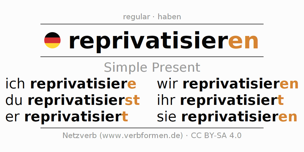 The verb reprivatisieren fully conjugated in all persons and numbers in the Present Indicative