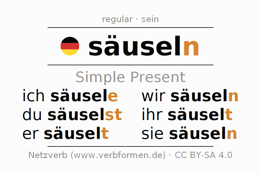 The conjugation of säuseln in the present tense is: ich säus(e)le, du säuselst, er säuselt, wir säuseln, ihr säuselt, sie säuseln. For this purpose, the endings -e, -st, -t, -n, -t, -n are appended to the stem säusel. The endings in the 1st and 3rd person plural are shortened by "e", since the verb ends with -eln.In addition, the "e" in the stem can be omitted in the 1st person singular. The formation of the forms corresponds to the grammatical rules for the conjugation of the verbs in the present tense. Comments ☆