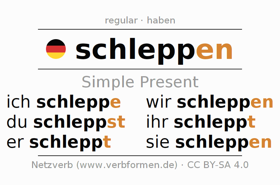 The verb schleppen fully conjugated in all persons and numbers in the Present Indicative