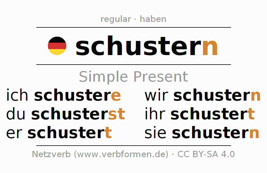 The conjugation of schustern (cobble, cobble veraltet) in the present tense is: ich schust(e)re, du schusterst, er schustert, wir schustern, ihr schustert, sie schustern. For this purpose, the endings -e, -st, -t, -n, -t, -n are appended to the stem schuster. The endings in the 1st and 3rd person plural are shortened by "e", since the verb ends with -ern. The formation of the forms corresponds to the grammatical rules for the conjugation of the verbs in the present tense. Comments ☆