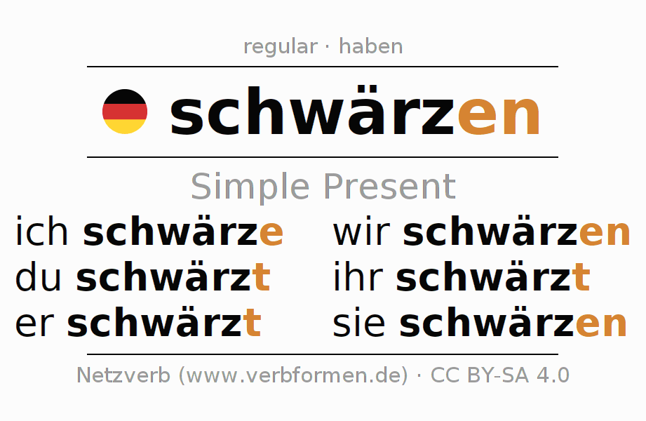The conjugation of schwärzen (blacken, black) in the present tense is: ich schwärze, du schwärzt, er schwärzt, wir schwärzen, ihr schwärzt, sie schwärzen. For this purpose, the endings -e, -t, -t, -en, -t, -en are appended to the stem schwärz. The ending in the second person singular is shortened by "s", since the stem already ends on -z. The formation of the forms corresponds to the grammatical rules for the conjugation of the verbs in the present tense. Comments ☆