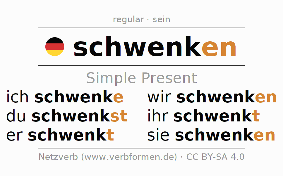 The conjugation of schwenken (swing, cant) in the present tense is: ich schwenke, du schwenkst, er schwenkt, wir schwenken, ihr schwenkt, sie schwenken. For this purpose, the endings -e, -st, -t, -en, -t, -en are appended to the stem schwenk. The formation of the forms corresponds to the grammatical rules for the conjugation of the verbs in the present tense. Comments ☆