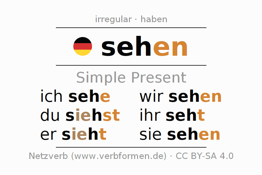 The conjugation of sehen (see, look) in the present tense is: ich sehe, du siehst, er sieht, wir sehen, ihr seht, sie sehen. For this purpose, the endings -e, -st, -t, -en, -t, -en are appended to the stem seh.As an irregular verb in the 2nd and 3rd person singular the changed present stem sieh- is used. The formation of the forms corresponds to the grammatical rules for the conjugation of the verbs in the present tense. Comments ☆