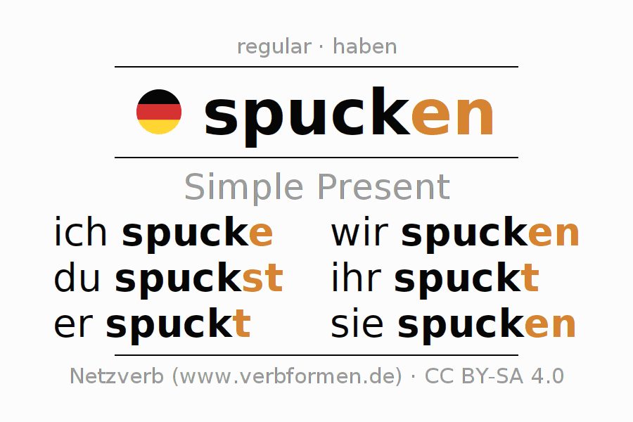 The conjugation of spucken (spit, vomit) in the present tense is: ich spucke, du spuckst, er spuckt, wir spucken, ihr spuckt, sie spucken. For this purpose, the endings -e, -st, -t, -en, -t, -en are appended to the stem spuck. The formation of the forms corresponds to the grammatical rules for the conjugation of the verbs in the present tense. Comments ☆