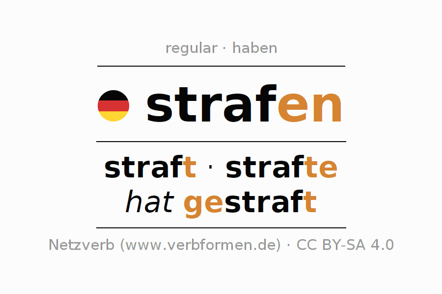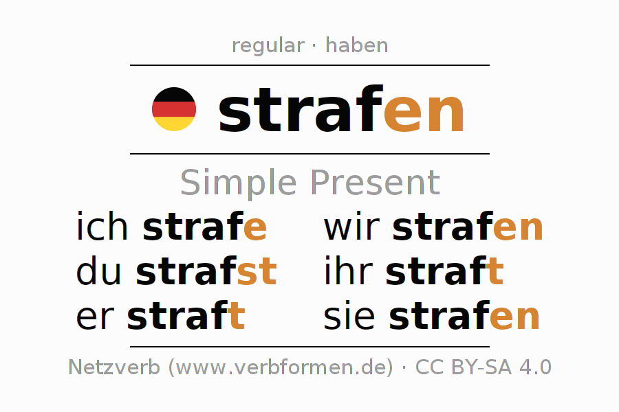 The conjugation of strafen (punish, penalize) in the present tense is: ich strafe, du strafst, er straft, wir strafen, ihr straft, sie strafen. For this purpose, the endings -e, -st, -t, -en, -t, -en are appended to the stem straf. The formation of the forms corresponds to the grammatical rules for the conjugation of the verbs in the present tense. Comments ☆