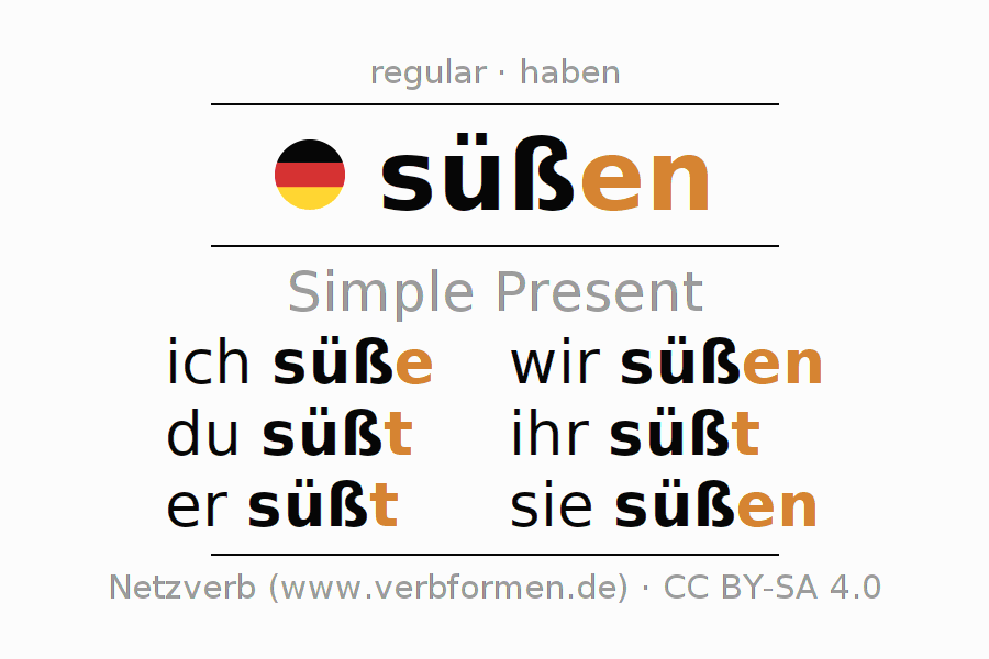 The verb süßen fully conjugated in all persons and numbers in the Present Indicative