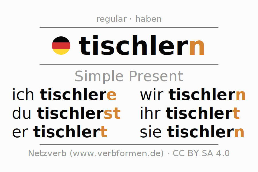 The verb tischlern fully conjugated in all persons and numbers in the Present Indicative