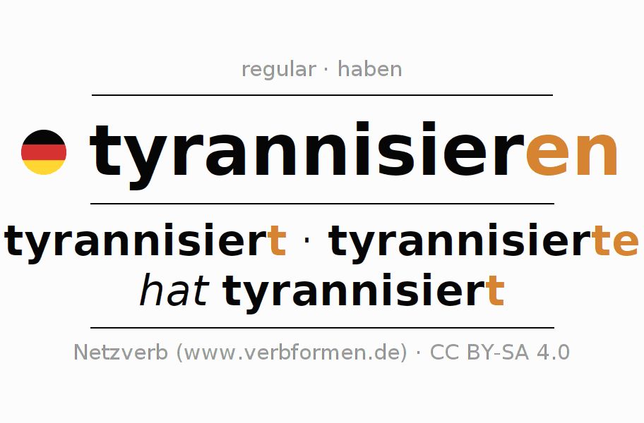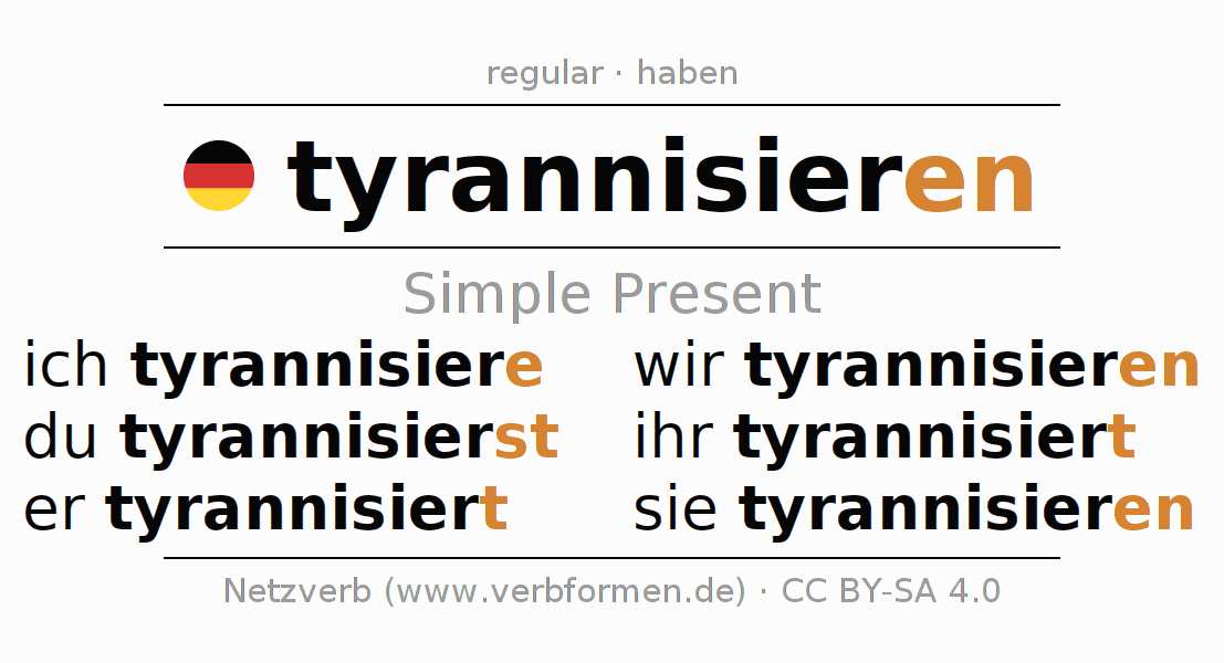 The conjugation of tyrannisieren (tyrannize, oppress) in the present tense is: ich tyrannisiere, du tyrannisierst, er tyrannisiert, wir tyrannisieren, ihr tyrannisiert, sie tyrannisieren. For this purpose, the endings -e, -st, -t, -en, -t, -en are appended to the stem tyrannisier. The formation of the forms corresponds to the grammatical rules for the conjugation of the verbs in the present tense. Comments ☆