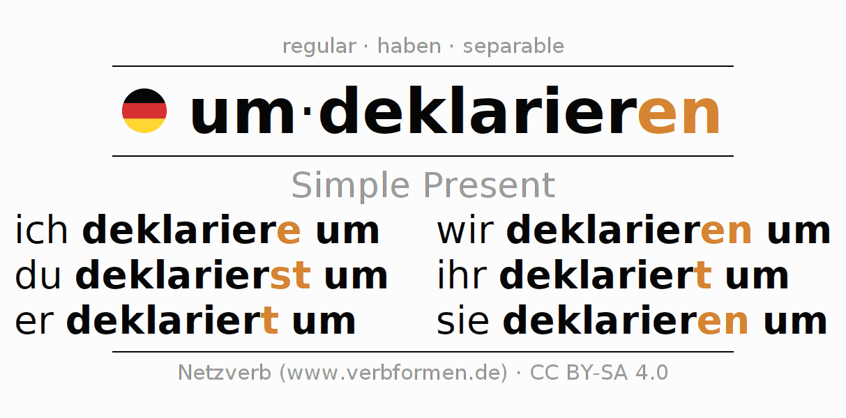 The verb umdeklarieren fully conjugated in all persons and numbers in the Present Indicative