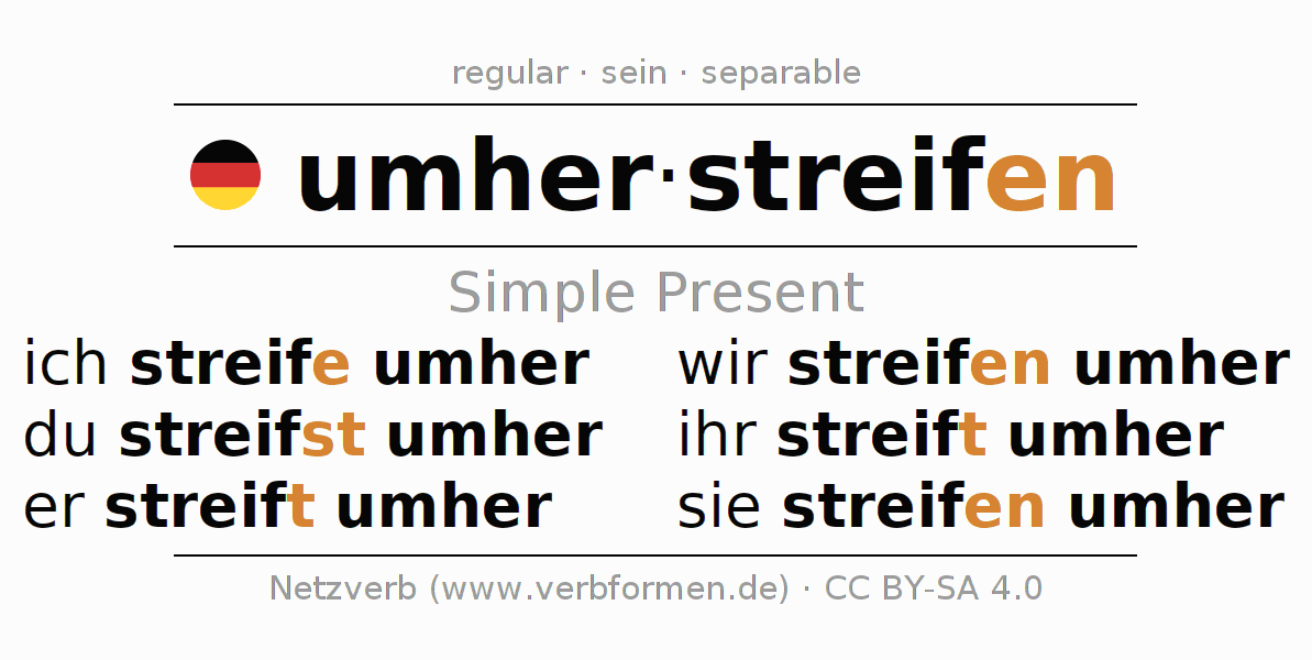 The conjugation of umherstreifen (roam, stray) in the present tense is: ich streife umher, du streifst umher, er streift umher, wir streifen umher, ihr streift umher, sie streifen umher. For this purpose, the endings -e, -st, -t, -en, -t, -en are appended to the stem streif. The prefix umher- of umherstreifen is separated.The formation of the forms corresponds to the grammatical rules for the conjugation of the verbs in the present tense. Comments ☆