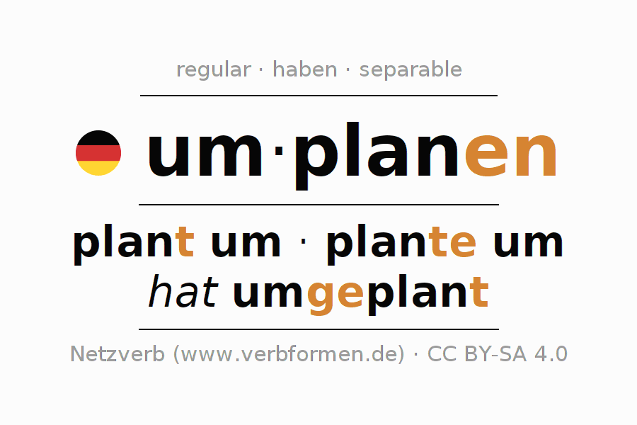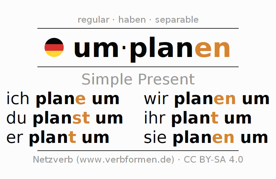 The conjugation of umplanen (redesign, reorganize) in the present tense is: ich plane um, du planst um, er plant um, wir planen um, ihr plant um, sie planen um. For this purpose, the endings -e, -st, -t, -en, -t, -en are appended to the stem plan. The prefix um- of umplanen is separated.The formation of the forms corresponds to the grammatical rules for the conjugation of the verbs in the present tense. Comments ☆