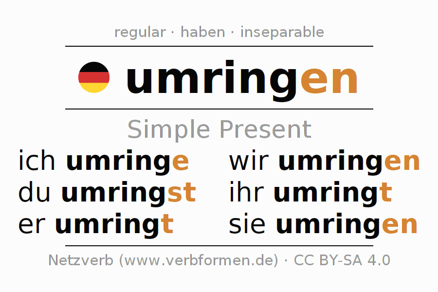 The verb umringen fully conjugated in all persons and numbers in the Present Indicative