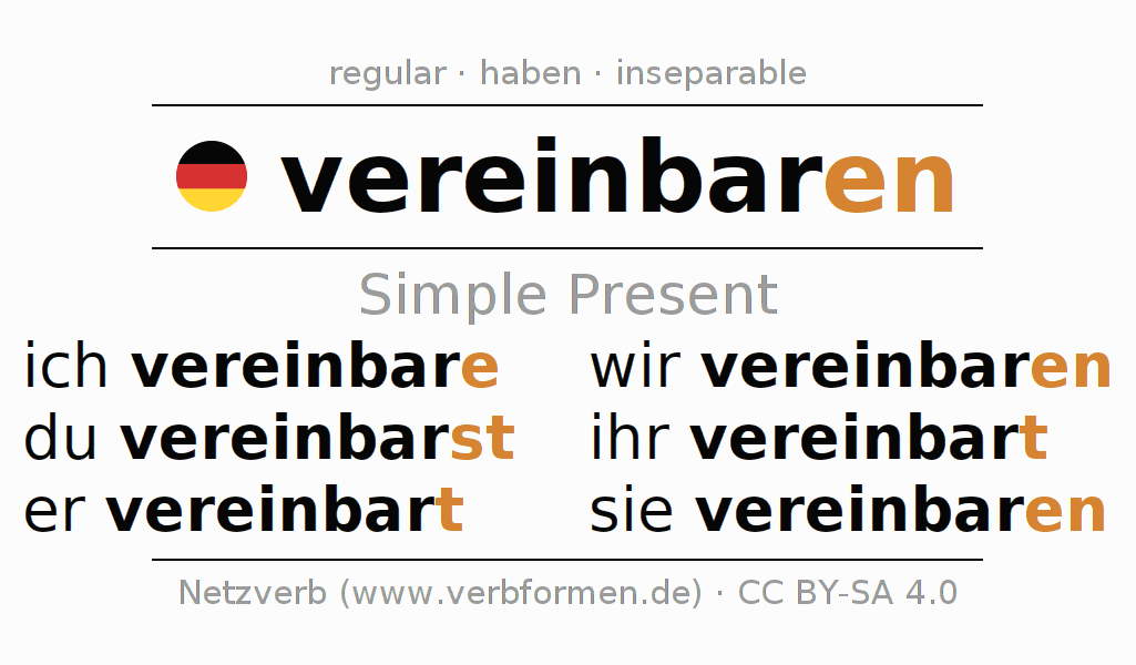 The conjugation of vereinbaren (agree, arrange) in the present tense is: ich vereinbare, du vereinbarst, er vereinbart, wir vereinbaren, ihr vereinbart, sie vereinbaren. For this purpose, the endings -e, -st, -t, -en, -t, -en are appended to the stem bar. The formation of the forms corresponds to the grammatical rules for the conjugation of the verbs in the present tense. Comments ☆