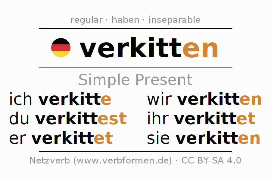The conjugation of verkitten (agglutinate, cement) in the present tense is: ich verkitte, du verkittest, er verkittet, wir verkitten, ihr verkittet, sie verkitten. For this purpose, the endings -e, -est, -et, -en, -et, -en are appended to the stem kitt. The endings in the 2nd and 3rd person singular and in the 2nd person plural are extended by "e", as the stem ends on -t. The formation of the forms corresponds to the grammatical rules for the conjugation of the verbs in the present tense. Comments ☆