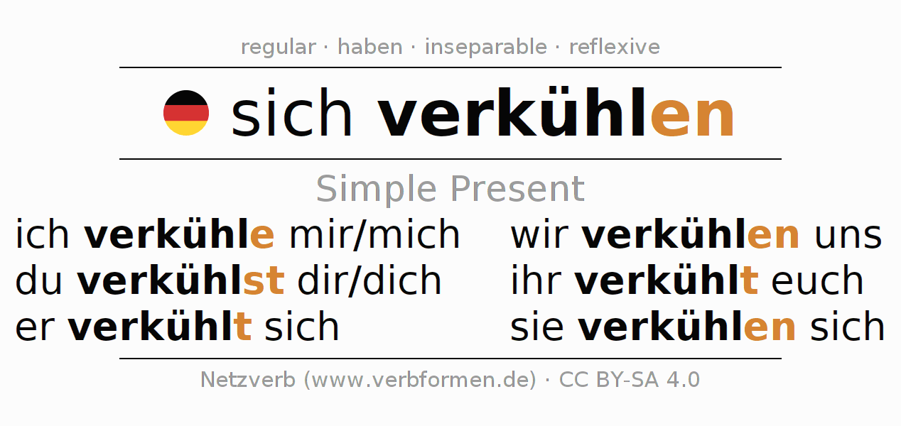 The conjugation of sich verkühlen (catch a cold, catch a chill) in the present tense is: ich verkühle mir/mich, du verkühlst dir/dich, er verkühlt sich, wir verkühlen uns, ihr verkühlt euch, sie verkühlen sich. For this purpose, the endings -e, -st, -t, -en, -t, -en are appended to the stem kühl. The formation of the forms corresponds to the grammatical rules for the conjugation of the verbs in the present tense. Comments ☆