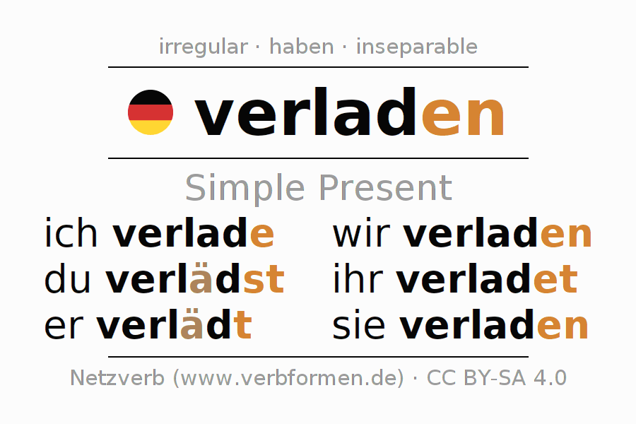 The conjugation of verladen (load, betray) in the present tense is: ich verlade, du verlädst, er verlädt, wir verladen, ihr verladet, sie verladen. For this purpose, the endings -e, -st, -t, -en, -et, -en are appended to the stem lad.As an irregular verb in the 2nd and 3rd person singular the changed present stem läd- is used. The ending in the second person plural is extended by "e", since the stem ends on -d. In the 3rd person singular, the -t of the ending coincides with the stem, so there is no ending. The formation of the forms corresponds to the grammatical rules for the conjugation of the verbs in the present tense. Comments ☆