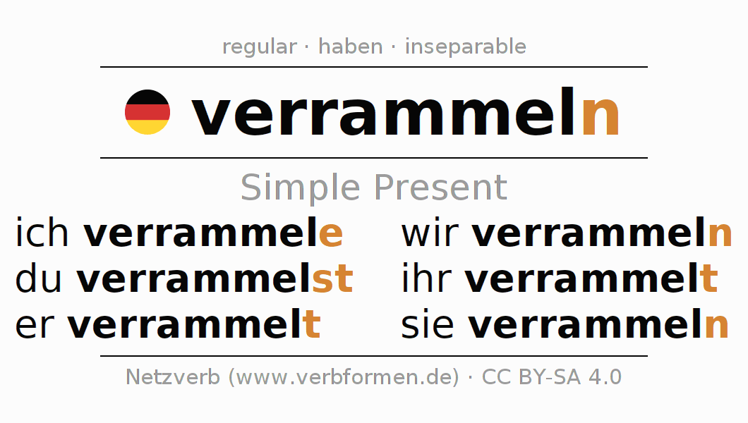The verb verrammeln fully conjugated in all persons and numbers in the Present Indicative