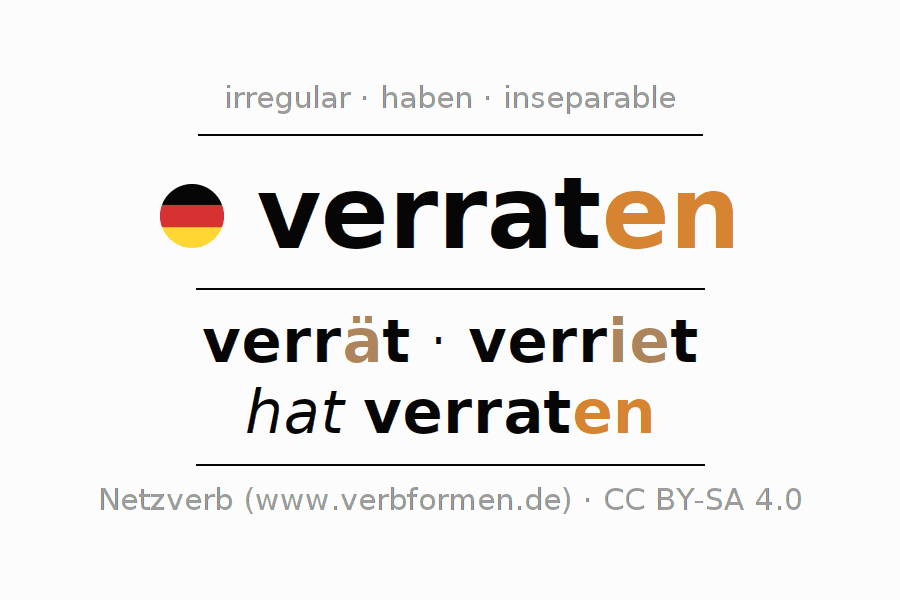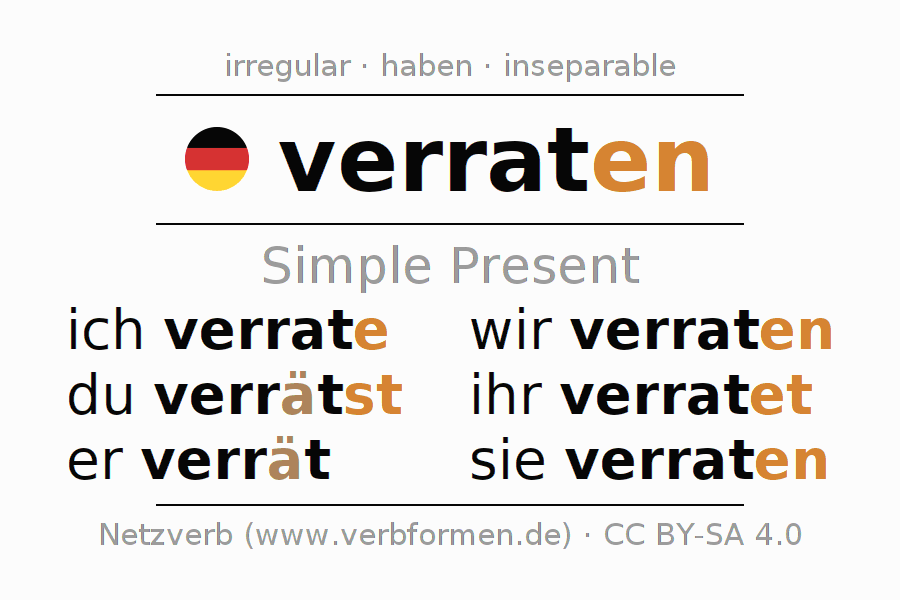 The conjugation of verraten (betray, reveal) in the present tense is: ich verrate, du verrätst, er verrät, wir verraten, ihr verratet, sie verraten. For this purpose, the endings -e, -st, -, -en, -et, -en are appended to the stem rat.As an irregular verb in the 2nd and 3rd person singular the changed present stem rät- is used. The ending in the second person plural is extended by "e", since the stem ends on -t. In the 3rd person singular, the -t of the ending coincides with the stem, so there is no ending. The formation of the forms corresponds to the grammatical rules for the conjugation of the verbs in the present tense. Comments ☆
