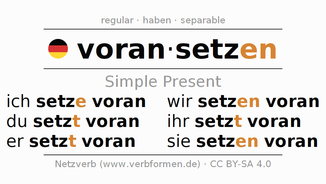 The conjugation of voransetzen (move up, reschedule) in the present tense is: ich setze voran, du setzt voran, er setzt voran, wir setzen voran, ihr setzt voran, sie setzen voran. For this purpose, the endings -e, -t, -t, -en, -t, -en are appended to the stem setz. The ending in the second person singular is shortened by "s", since the stem already ends on -z. The prefix voran- of voransetzen is separated.The formation of the forms corresponds to the grammatical rules for the conjugation of the verbs in the present tense. Comments ☆